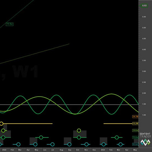 Although the main enactment of the short trade we are examining here came in November 2021 every trade must have some kind of context and supporting underlying trend (Sigma-L) to assist in entry. The longer term phasing in natural gas had suggested as early as September 2021 that the 18 month component was peaking.