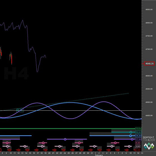We noted that price had been bouncing off the 40 week FLD for weeks and, if the move down was to occur as predicted, a good price target would be back at the 40 week FLD support around 4350-4400. The 20 week upward FLD was also a target, a cross of this would also confirm a peak of 40 week magnitude had indeed occurred.