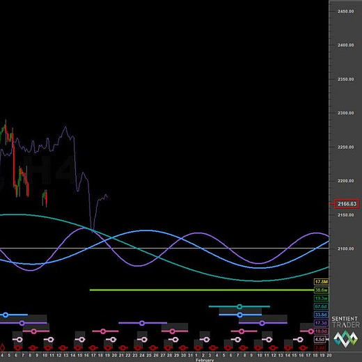 The average wavelength of the 80 day and 20 week components were noted and a timeframe for the target being met calculated for the end of January to the first week of February 2022. This is also reflected in the ‘nest of lows’ shown above in the Sentient Trader software. A standard entry of a 20 day FLD cross would be used but other viable entry points were the 10 day FLD (pink) and 10 day VTL, both providing slightly higher risk:reward ratios but with added cyclical risk.