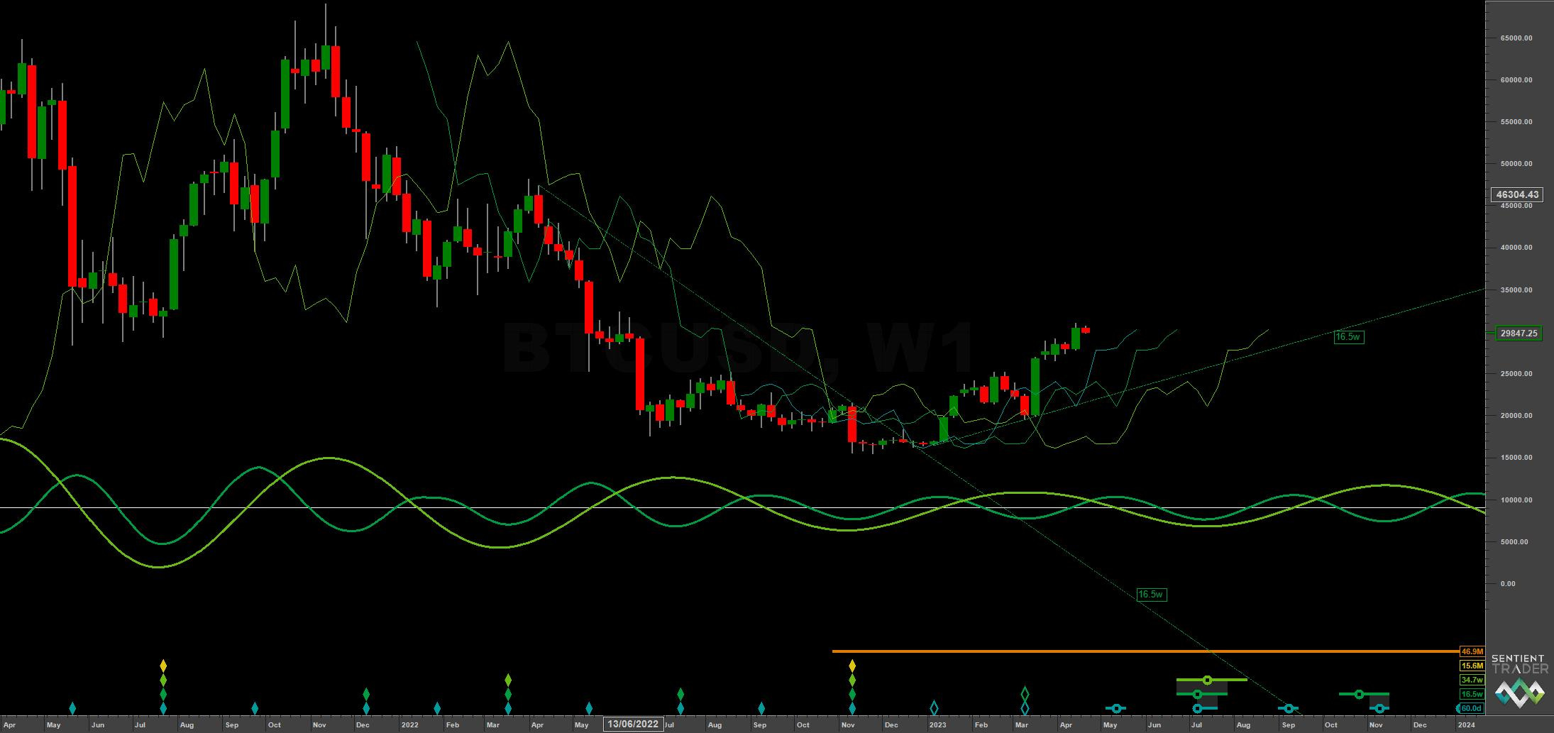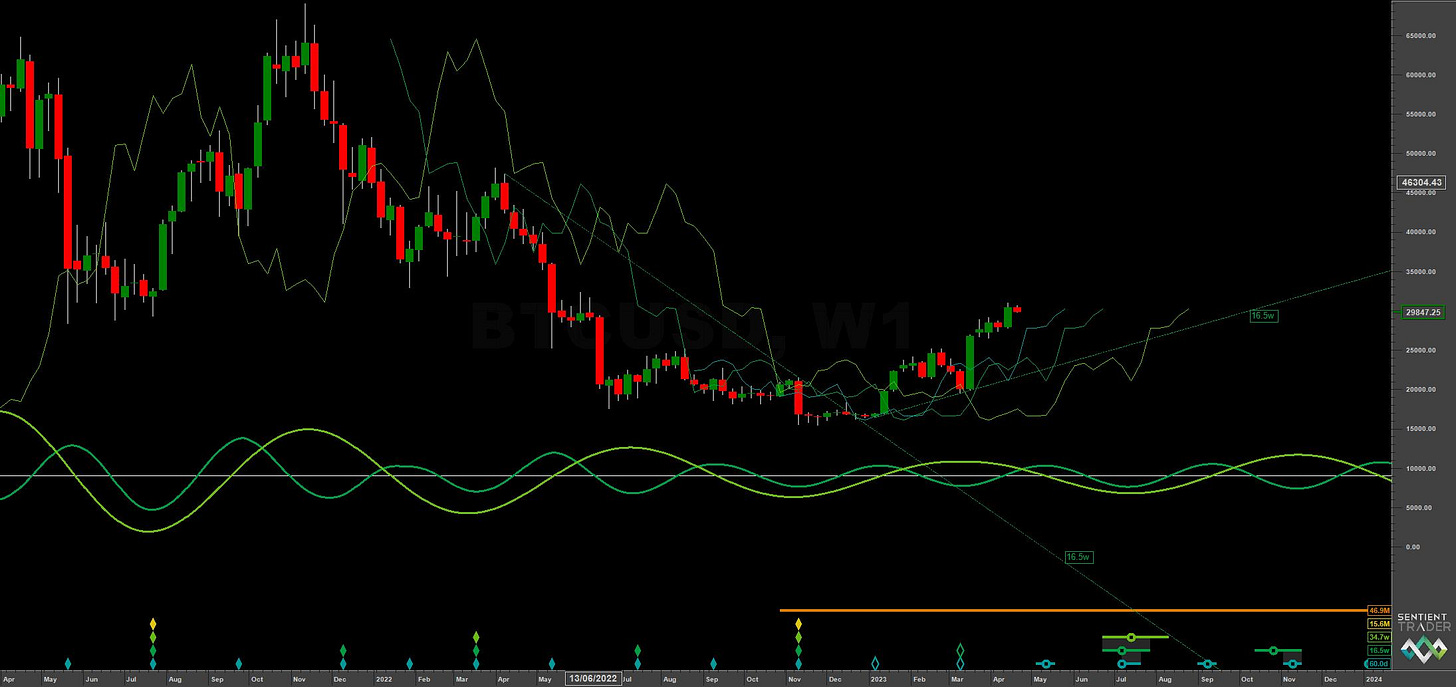 The 18 month ‘nominal’ component low in cryptocurrency and, more specifically, Bitcoin was established in November 2022, amongst some grinding and sideways price action. With the somewhat reinvigorated 80 day component (~ 65-75 days) now regaining clarity we can start to assess the phasing of the crypto king with more confidence at the short and medium term. Price has reached and slightly exceeded the 18 month FLD cross at 29310, as shown on the long term Sentient Trader phasing analysis below. Price is now due a nominal 20 week component peak.