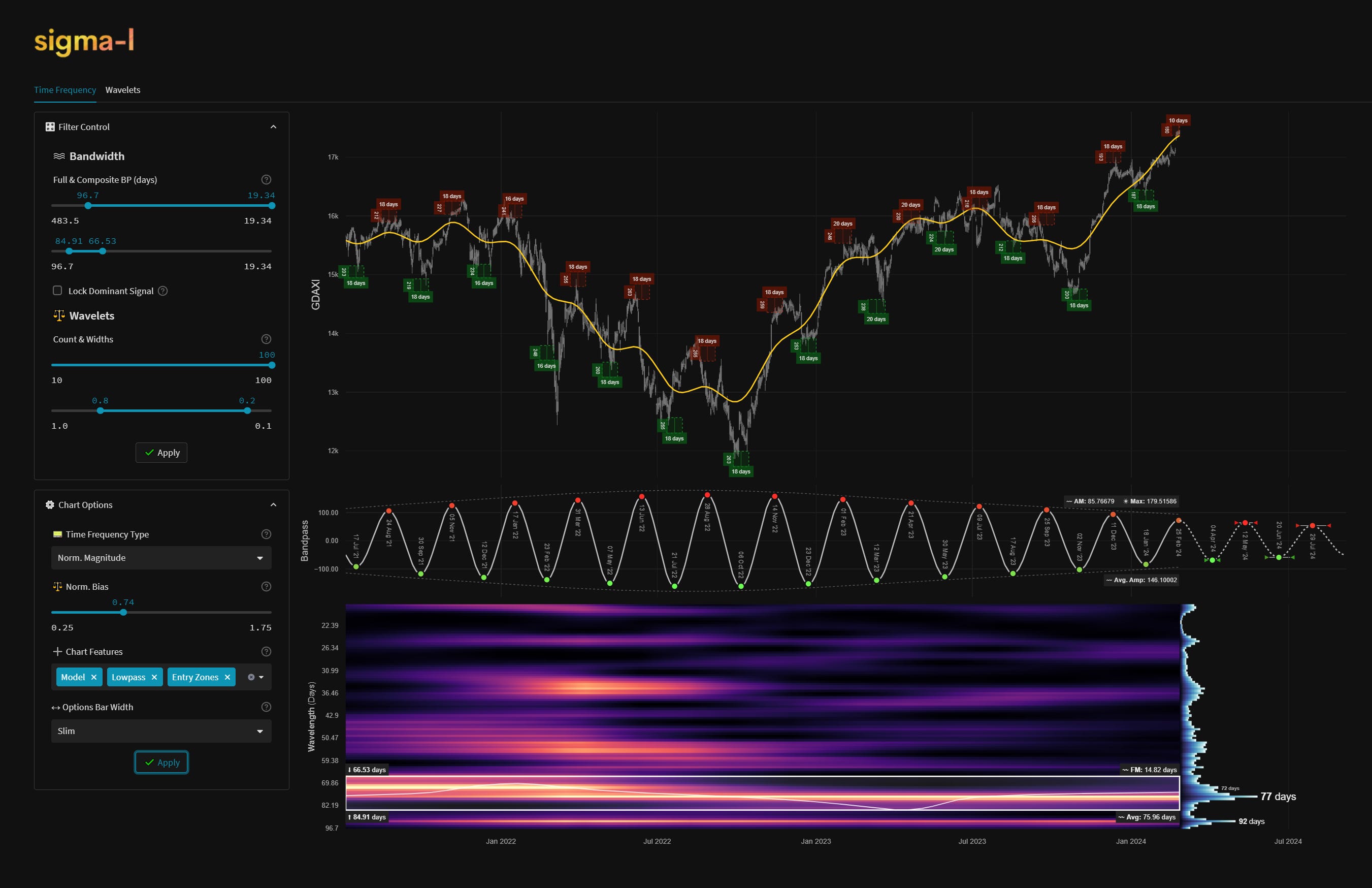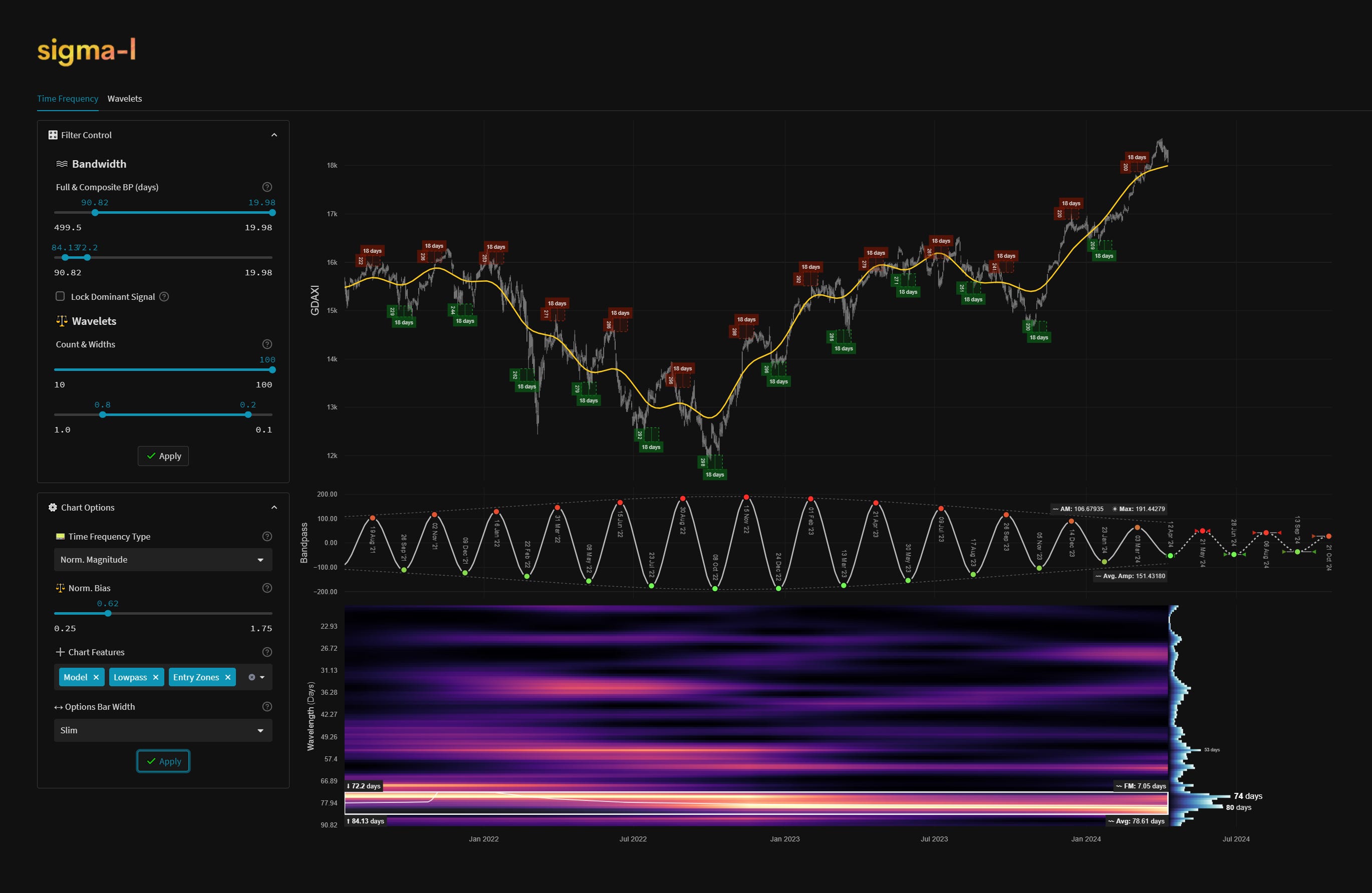 Time frequency charts (learn more) below will typically show the cycle of interest against price, the bandpass output alone and the bandwidth of the component in the time frequency heatmap, framed in white. If a second chart is displayed it will usually show high-passed price with the extracted signal overlaid for visual clarity.