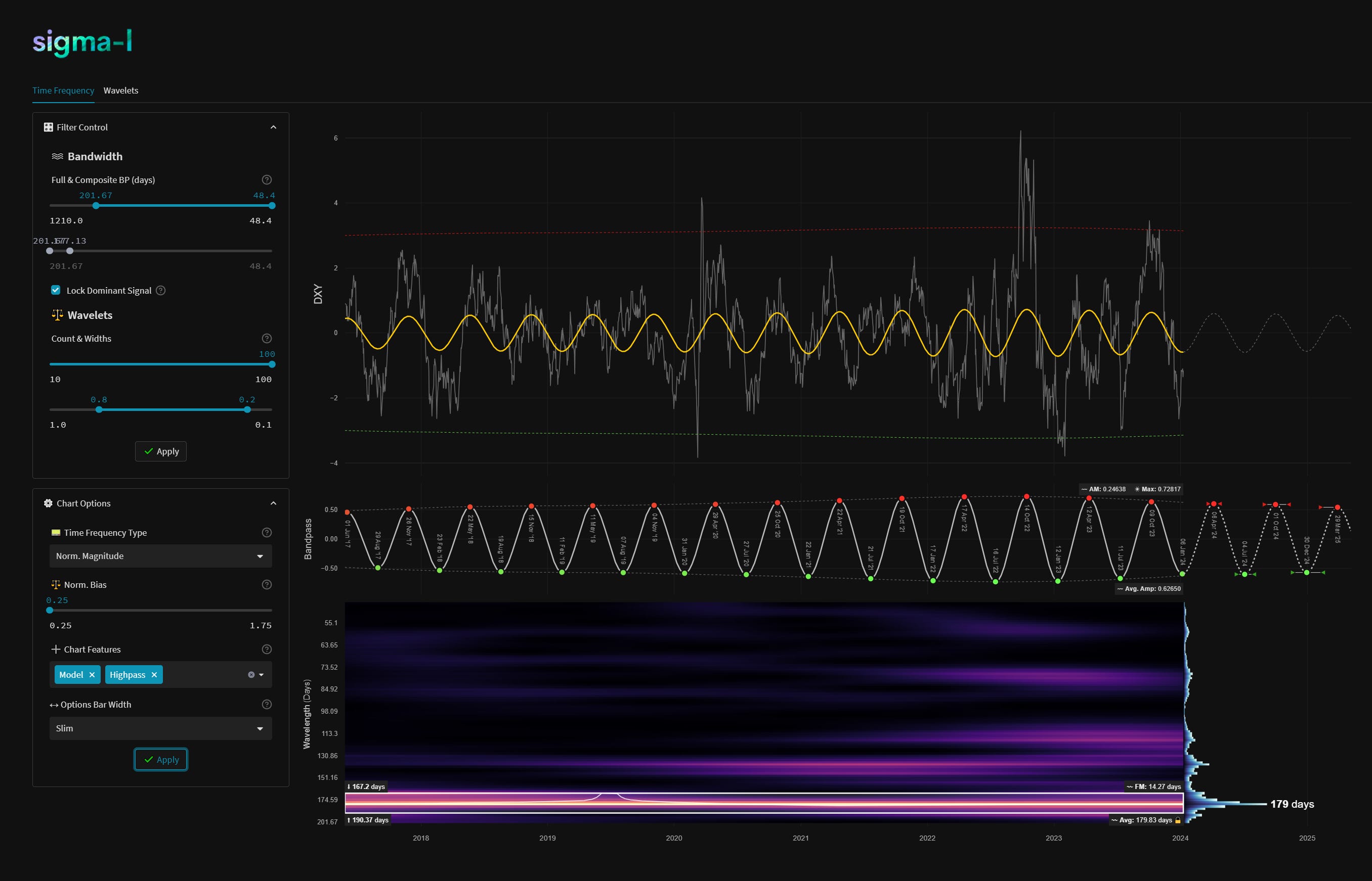 Time frequency charts (learn more) below will typically show the cycle of interest against price, the bandpass output alone and the bandwidth of the component in the time frequency heatmap, framed in white. If a second chart is displayed it will usually show high-passed price with the extracted signal overlaid for visual clarity.