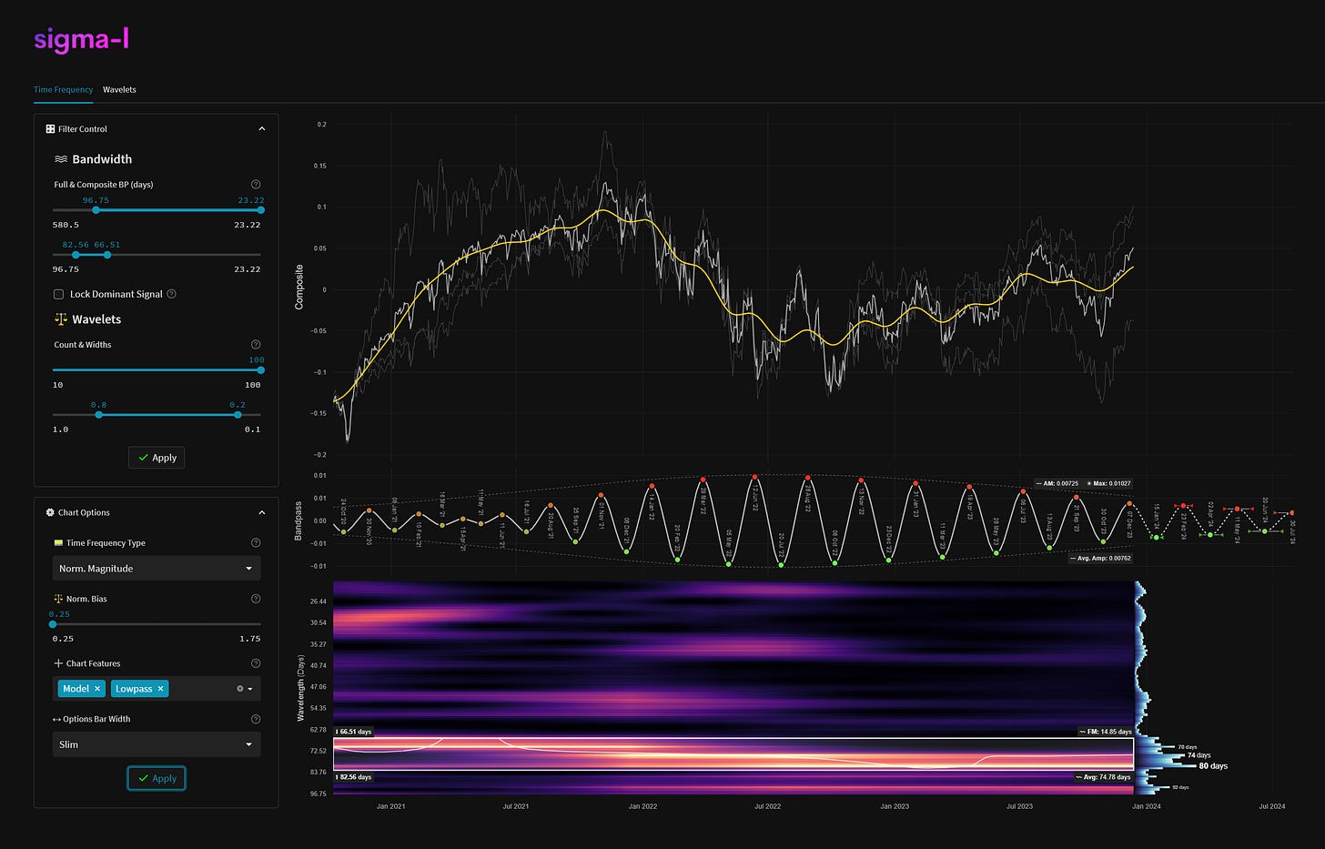 Time frequency charts (learn more) below will typically show the cycle of interest against price, the bandpass output alone and the bandwidth of the component in the time frequency heatmap, framed in white. If a second chart is displayed it will usually show high-passed price with the extracted signal overlaid for visual clarity.